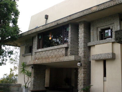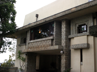 フランク・ロイド・ライト設計の邸宅は、芦屋の海を一望できる崖の上にあります。 帝国ホテルと似た雰囲気の意匠がたくさん見られますが、ここはホテルと違いプライベートな空間です。 デザインが彫られた軟らかい大谷石が家の外装にも、そして家の内部の壁や床へも多く用いられていました。 テラスからの眺望、室内の光の強弱、次の間へといざなうような階段や廊下の造り。 80年を経た館はますます多くの人々魅了していました。 私も何度でもここへ来で、細部をもっともっと見てみたくなりました。