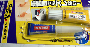 まずは、みなさん使っている瞬間接着剤。アロンアルファみたいなものです。セメダイン社の製品はロックタイトと言う商品名です。 この名前で、ヨーロッパでも売っていました!