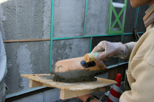 こんなことは楽勝さ!だって家で漆喰ぬったことあるものね〜〜♪♪!と思ったのですが、が、しかし、そんなに簡単じゃなかった・・・。 うまくくっつかないのです。 ボタボタボタボタ地面にモルタルが落ちちゃう!!