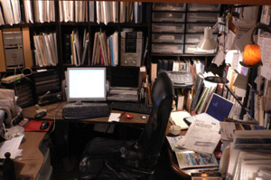 4畳半の和室を半分に区切り、壁面いっぱいに棚を作りつけて(山根式袋ファイル満タン状態)コの字型に机の天板で囲っているのでスペース的には実質1帖半といったところでしょうか。このマンションに引っ越してきたのが99年(前世紀)だったのでもう6年目です。
