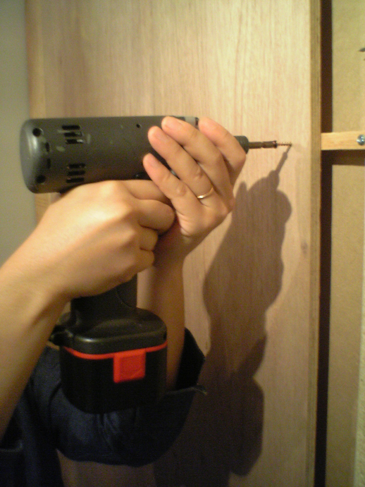 インパクトで下穴を開けて本棚本体に木ネジでとめていきます。