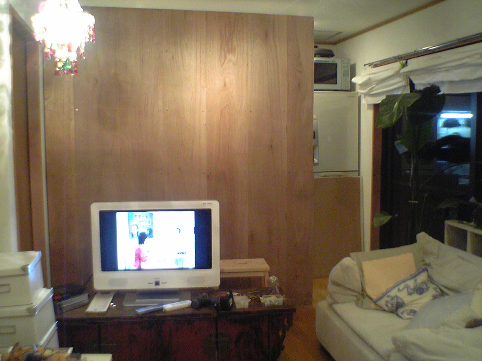 気を取り直して・・・。さあ、残るはTV側の壁。