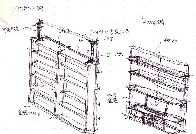 こんな風にキッチン側はイケアの組み立て本棚。