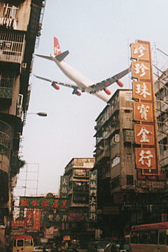 香港の町がずいぶんと下に見えているな、と、思うとずいぶん早いピッチで降下してゆきます。そして、考えられないような大きな角度でバンクを取って、急旋回、、遠心力を強く感じながら、窓の外を見ると、有名な違法建築の巨大コンプレックスの九龍城を翼が引っかかりそうな距離でかすめて、まだ、機体が傾いているのに滑走路に進入し、水平になった瞬間、即着陸なのです。