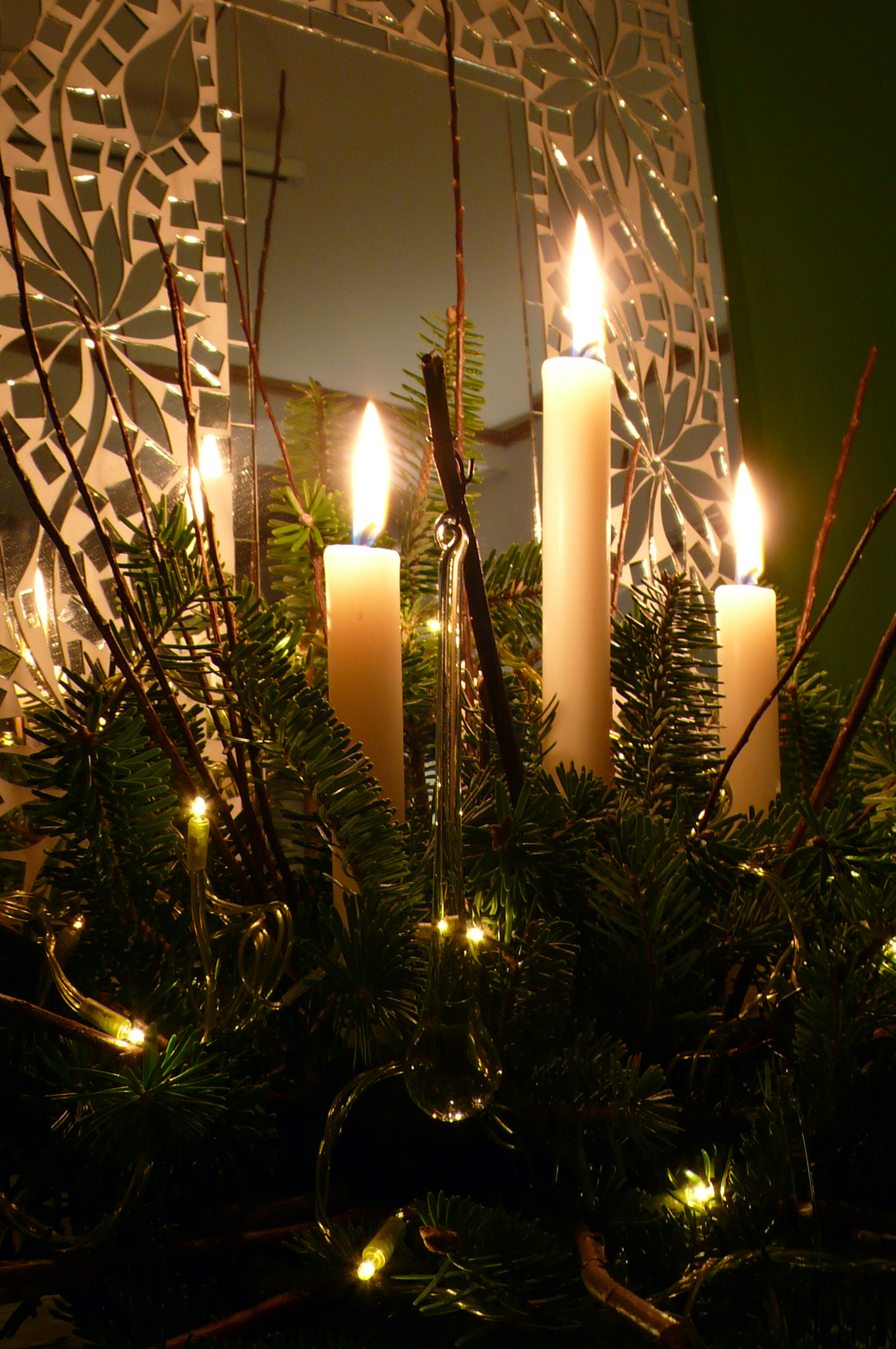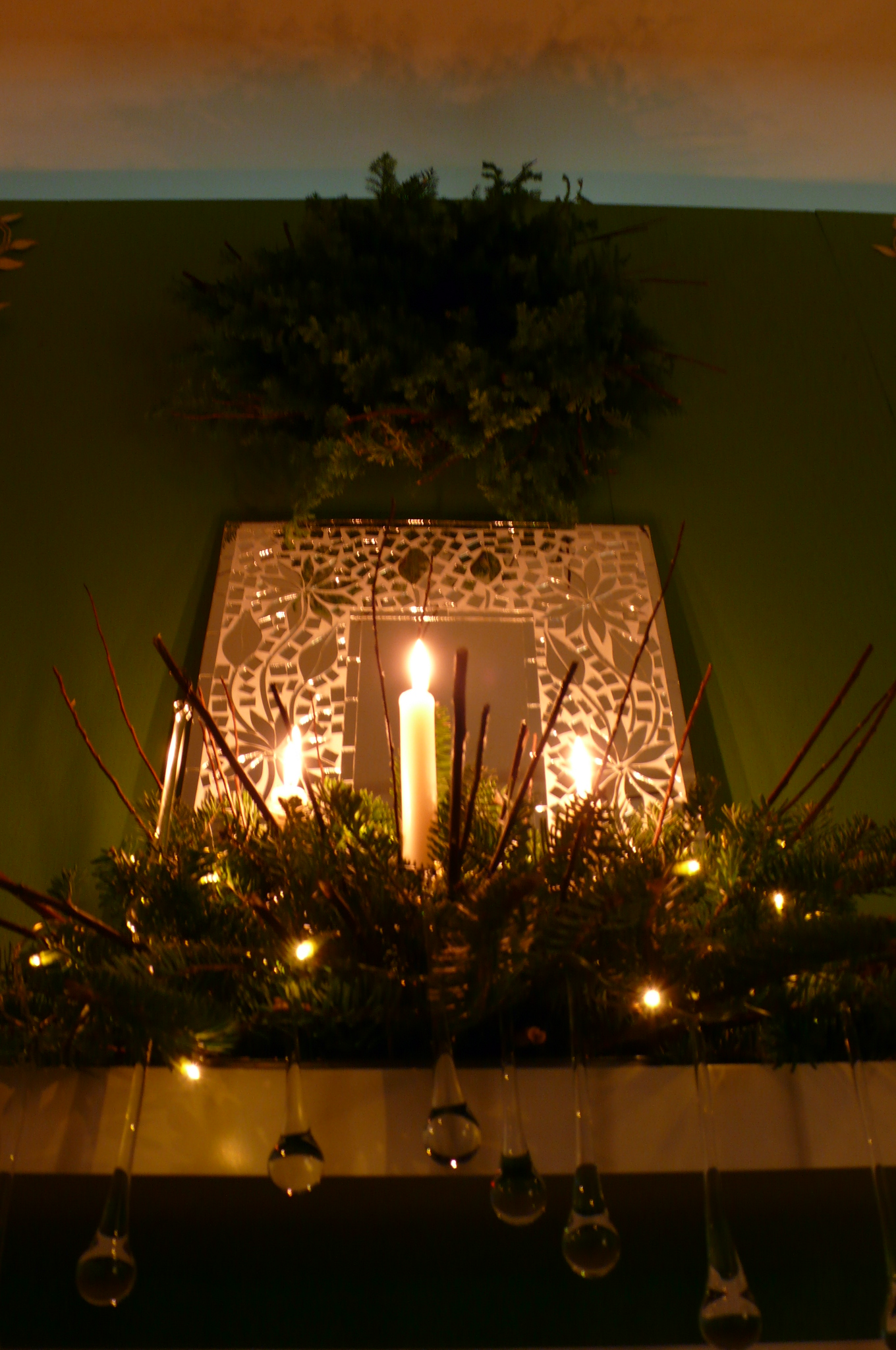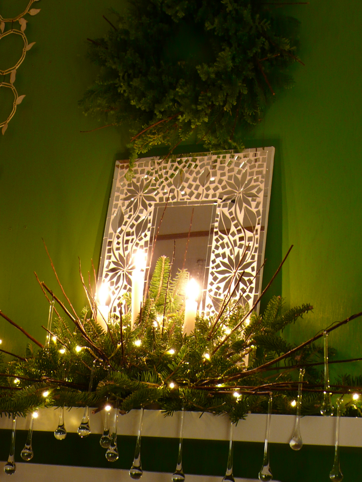 棚の上にはモミの木のガーランド。雨だれみたいなガラスの飾りです。