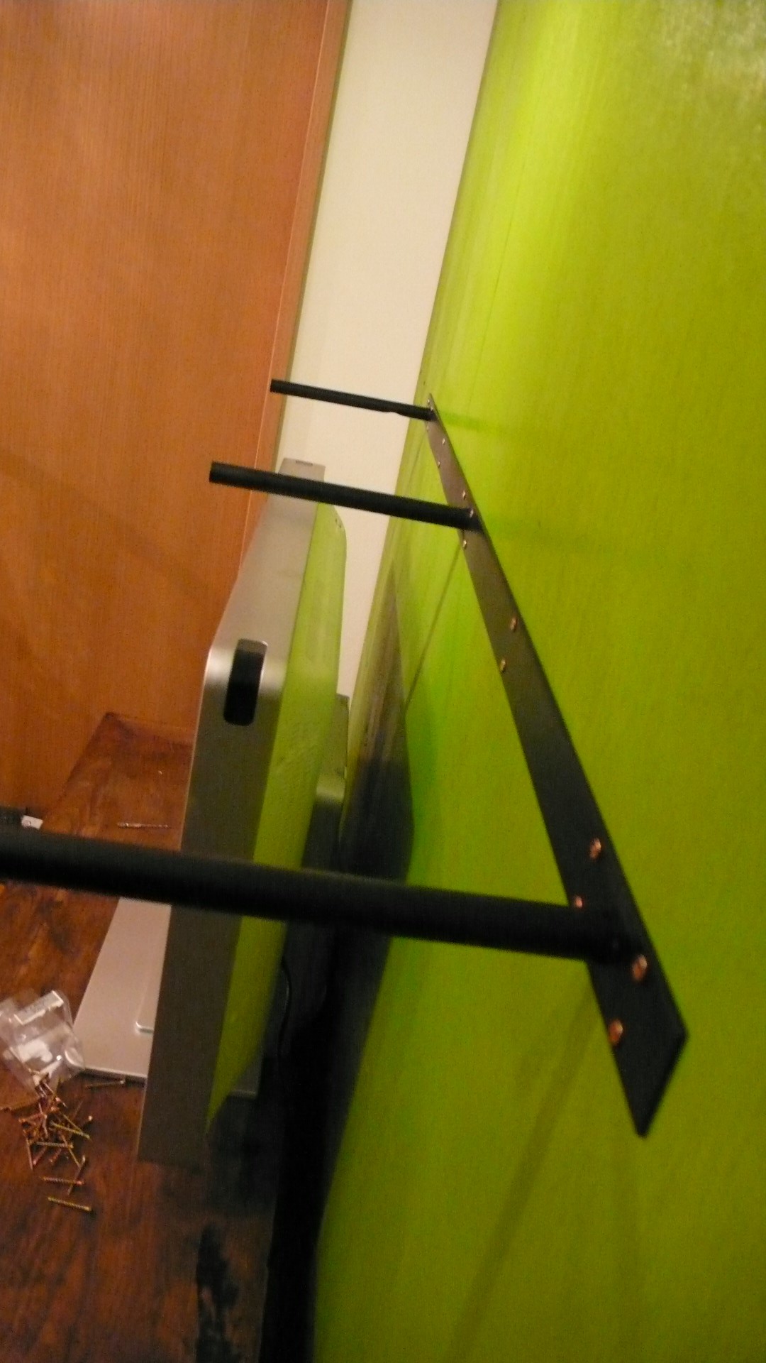 体重かけてみたけど思ったより大丈夫そう・・・・。がっちしはまってます。この鉄の棒に差し込んで完成・・・。インパクトドライバーと